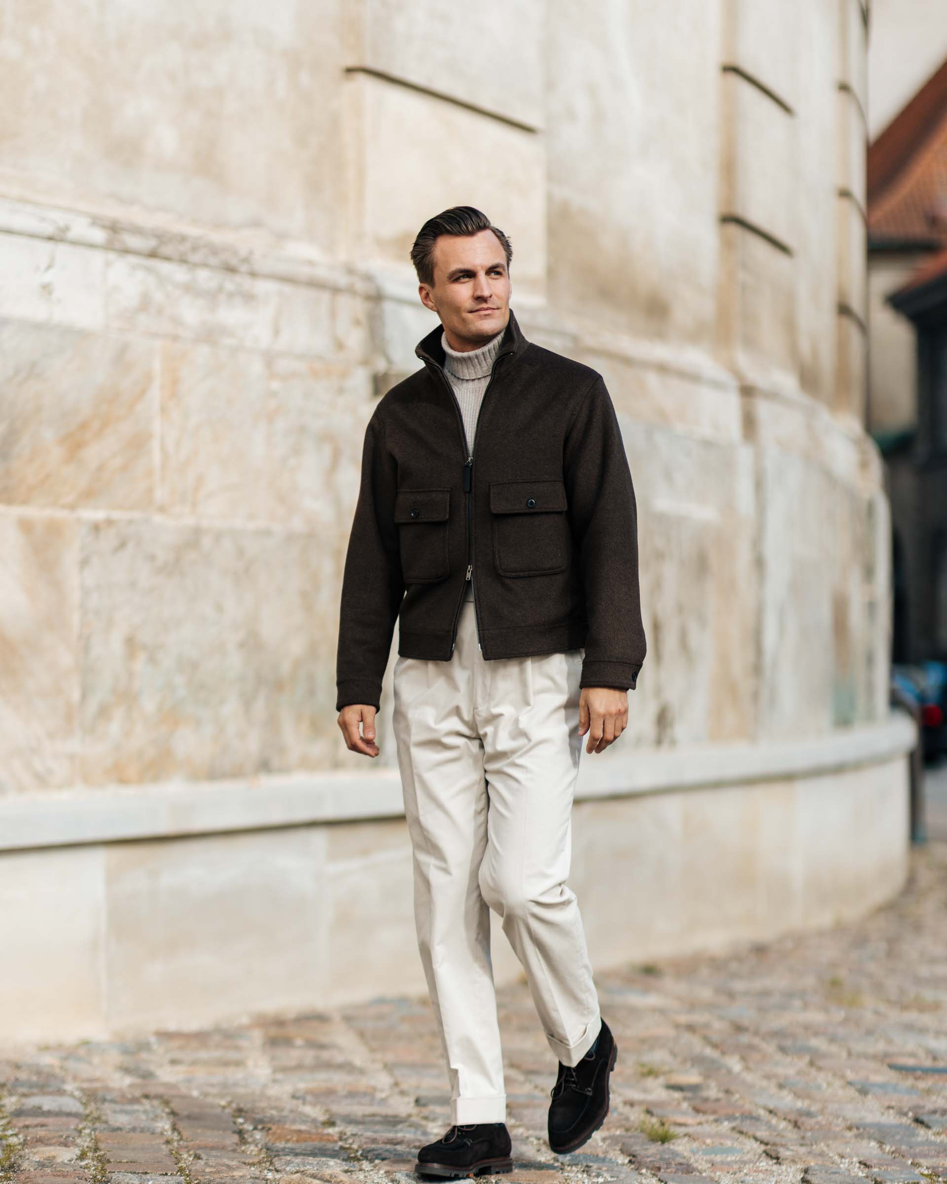 Dark Brown Wool-Cashmere Field Jacket, Sand Cashmere Rollneck, Off-White Courdury Trousers, Brown Suede Derby Shoes.