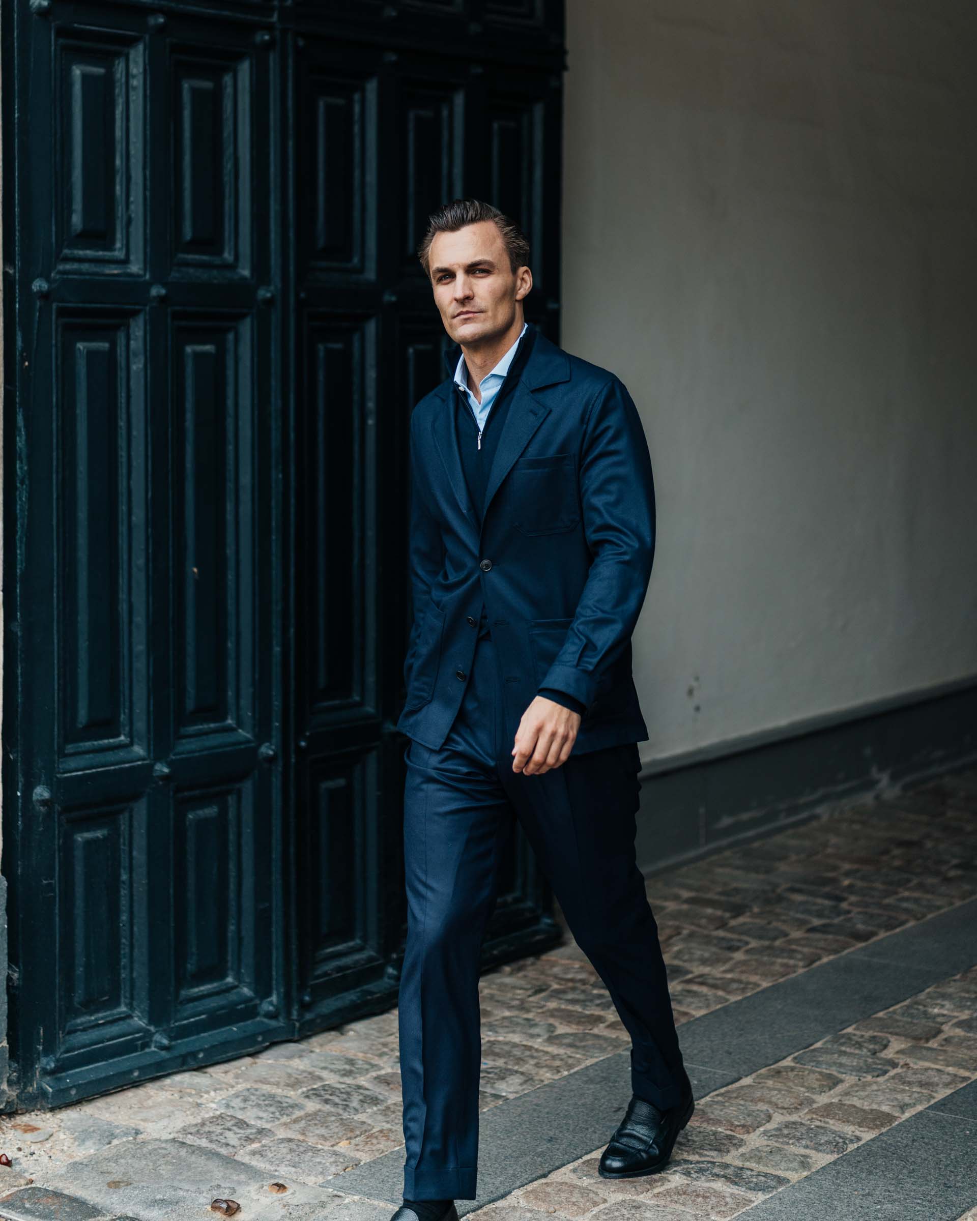Navy Wool Suit with Safari Jacket from Vitale Barberis Canonico, Light Blue Striped Poplin Shirt, Navy Cashmere Full Zip Knitwear, Black Leather Loafers.